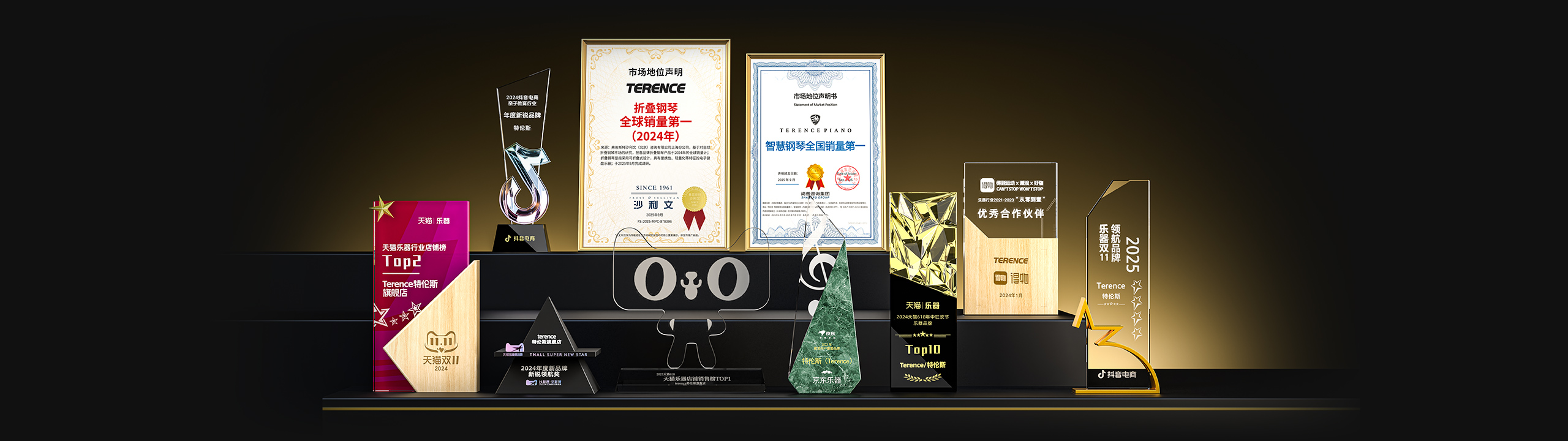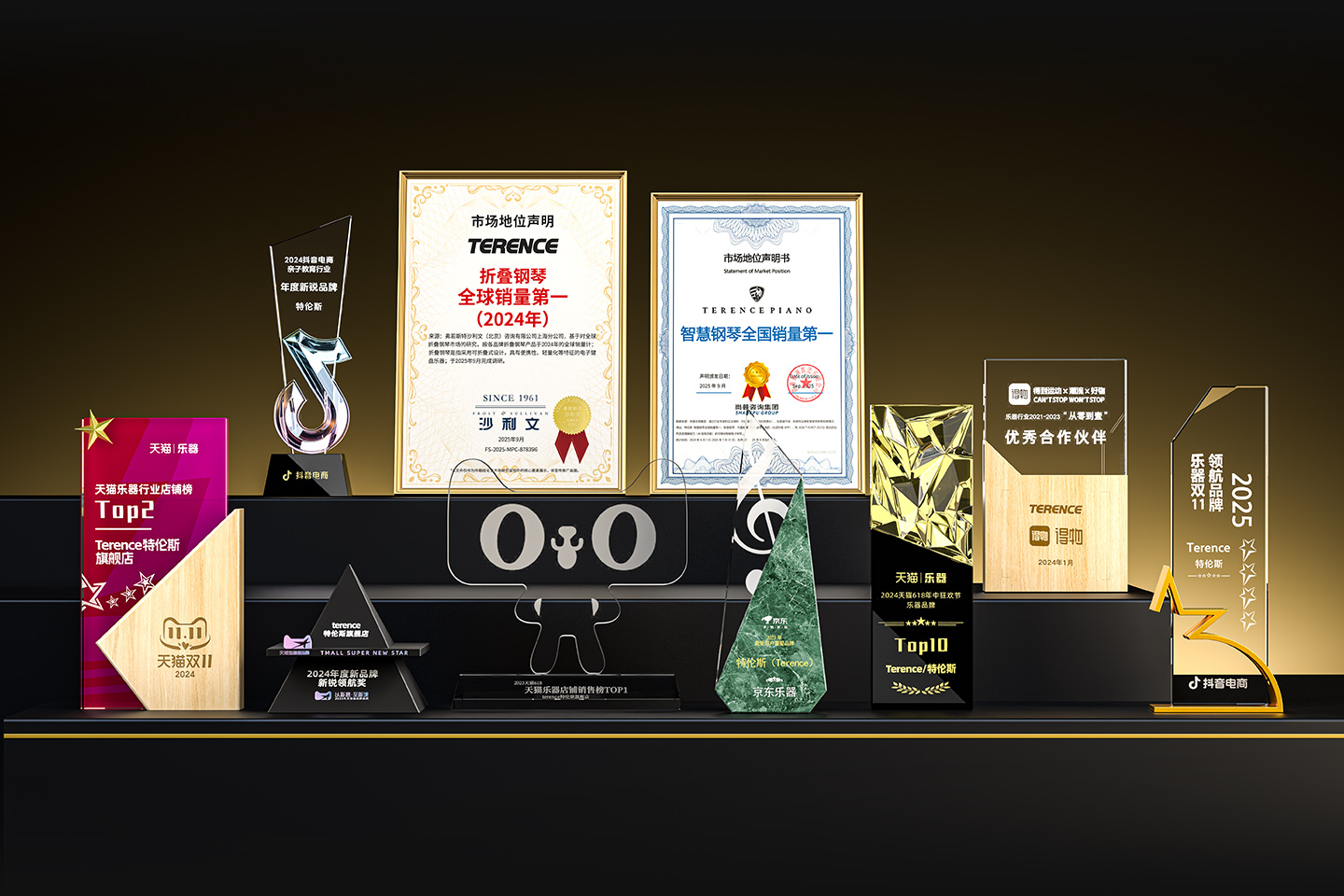 特倫斯創新科技榮獲:折疊鋼琴全球銷量第一(2024年)[1]、智慧鋼琴全國銷量第一[2]、2025年天貓618樂器設備店鋪榜TOP2、2025年天貓雙11樂器店鋪榜TOP1、2025年天貓雙11樂器品牌榜TOP3、2022年天貓樂器行業TOP1、2023年天貓618樂器行業TOP1、2024抖音電商年度新銳品牌、2024天貓樂器店鋪TOP2、2024天貓年度新品牌新銳領航獎、2023年京東最受用戶喜愛品牌等獎項;